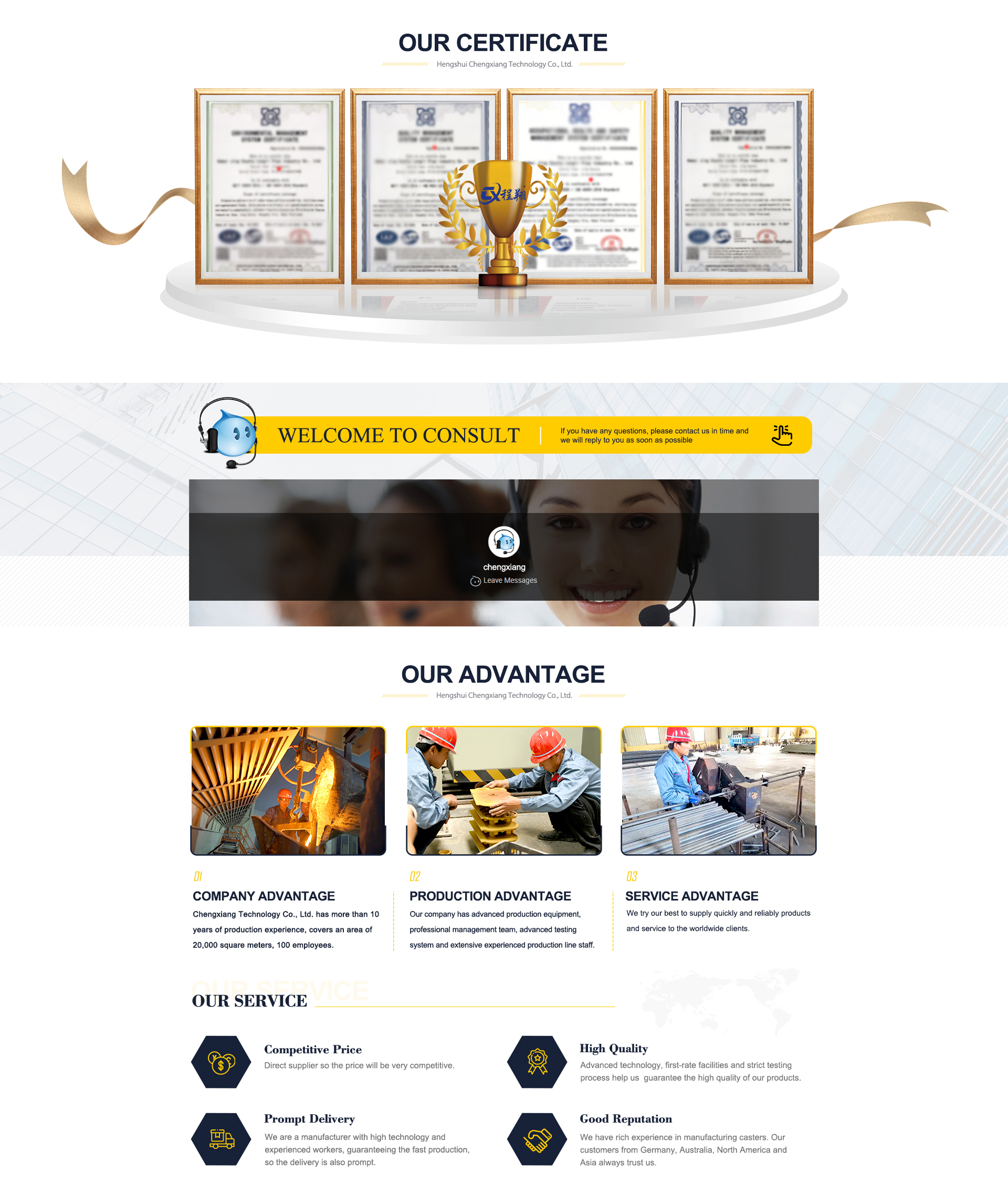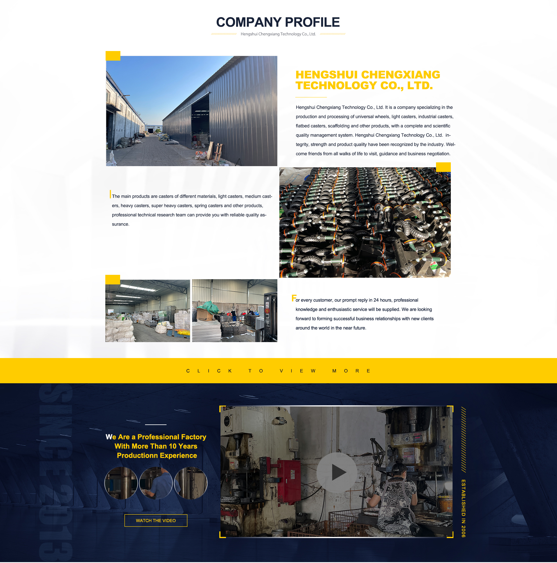 Principais produtos:Roda universal de nylon branco, rodízio de rolamento único preto silencioso, rodízio amarelo de rolamento único, rodízios de poliuretano de núcleo de alumínio, roda de borracha de núcleo de alumínio